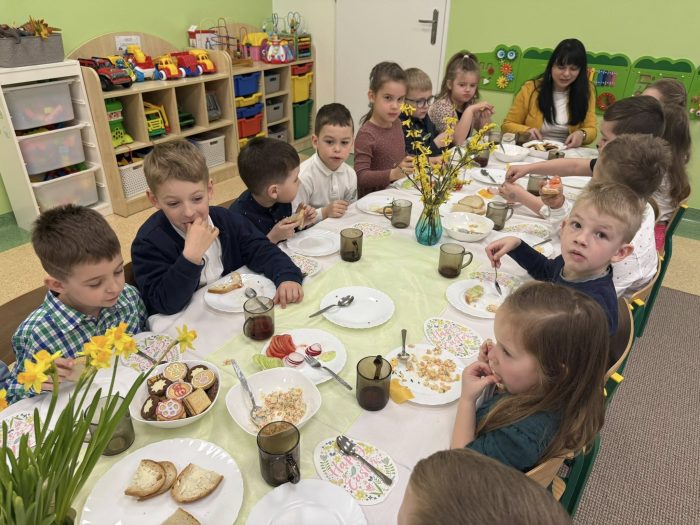 Na pięknie udekorowanych stołach nie zabrakło tradycyjnych, smacznych potraw. Jak widać – wszystko smakowało wyśmienicie. Przedszkolaki z wielkim apetytem zjadły przygotowane pyszności!
