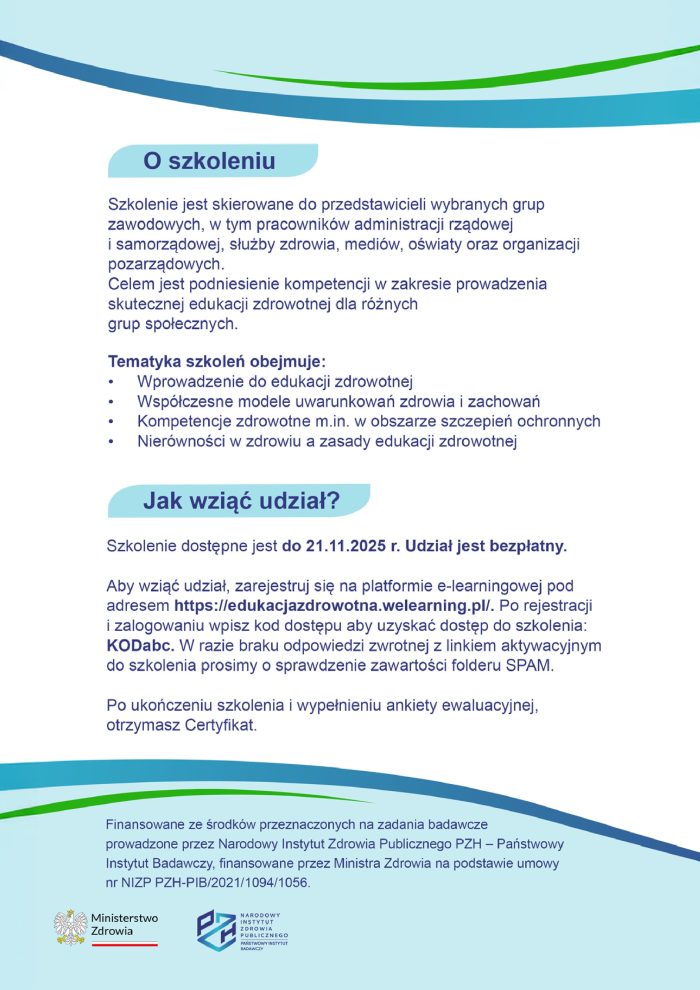 Bezpłatne szkolenia dot. edukacji zdrowotnej Czytaj artykuł (lektor) Drukuj stronę Wyświetl stronę w formacie PDF 7 listopada 2025
