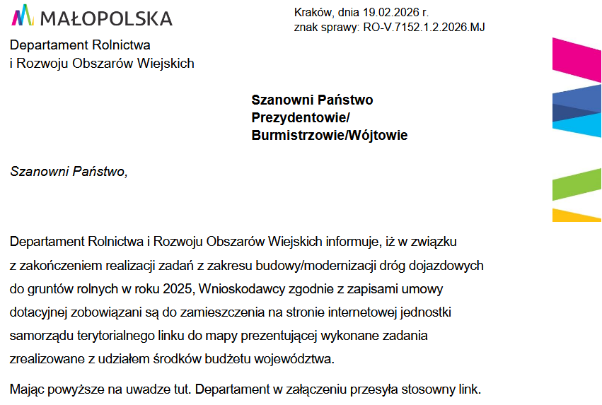 Drogi dojazdowe do gruntów rolnych Czytaj artykuł (lektor) Drukuj stronę Wyświetl stronę w formacie PDF 23 lutego 2026 https://mapymalopolski.pl/app/mapa/miip/drogi_rolnicze/