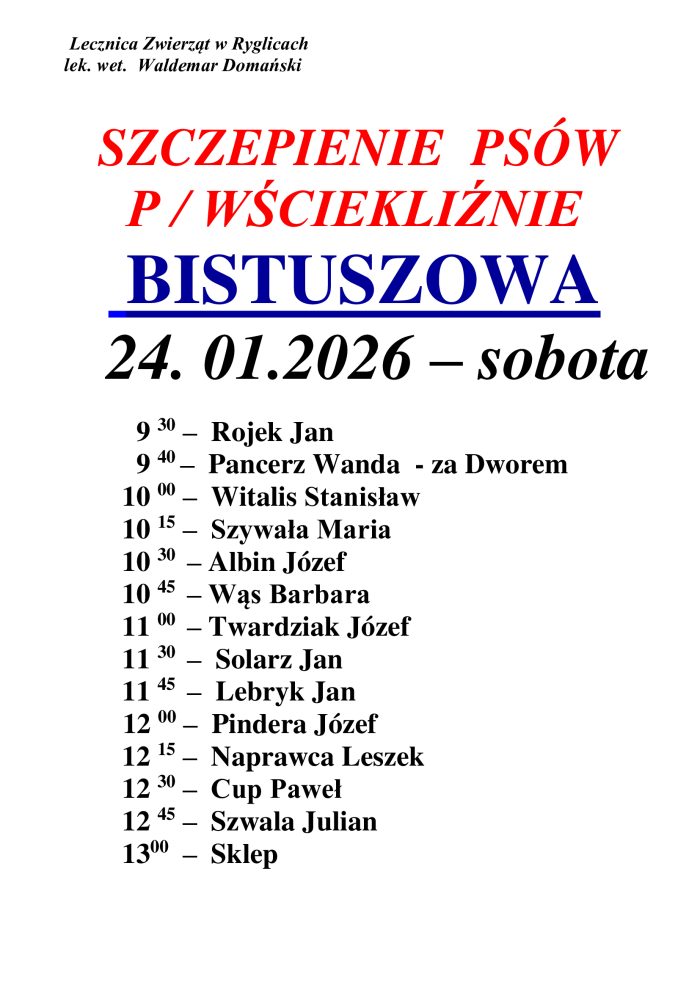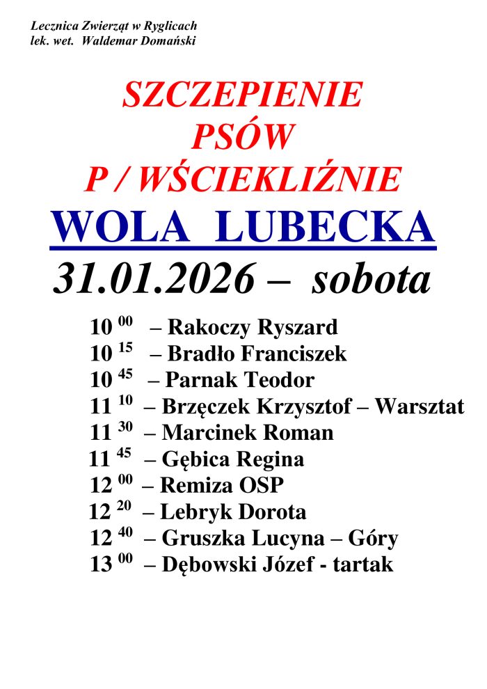 Harmonogram szczepień psów przeciwko wściekliźnie na styczeń 2026 r. Czytaj artykuł (lektor) Drukuj stronę Wyświetl stronę w formacie PDF 13 stycznia 2026